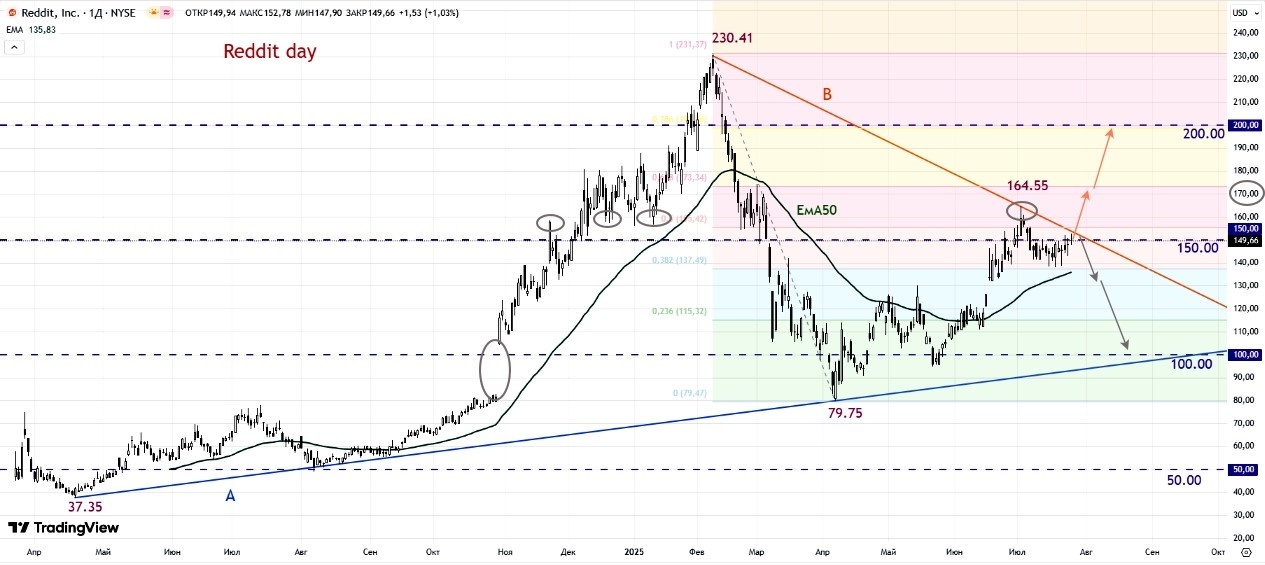 На дневном графике Reddit (RDDT) видно, что акции компании начали торговать на бирже только в марте 2024 г с отметки около уровня 50.00. К концу года бумага достигла уровня 150.00, что в 3 раза выше цена начала торгов. Новый рывок вверх пришелся на зимний период когда бумага сначала пробила психологическую круглую цифру 200.00, а потом достигла своего максимума на отметке 230.41. Неопределенность инвесторов и новая тарифная политика Трампа привела к общему падению рынка, в результате чего акции RDDT упали в 3 раза до отметки 79,75. Но к началу мая бумага поднялась выше круглой цифры 100.00, перейдя в боковой диапазон, шириной 30.0 $. В июне рост продолжился и бумага пробилась выше уровня 150.00, достигнув квартального максимума на отметке 164.55. Сейчас акции RDDT стабилизировались около уровня 150.00 и на хорошем отчете могут пробить линию сопротивления «В», обновить последний high и достигнуть уровня 200.00. Напротив, если отчет не понравится рынку, то бумага свалится до отметки 130.00 и даже рухнуть к сильному уровню 100.00.