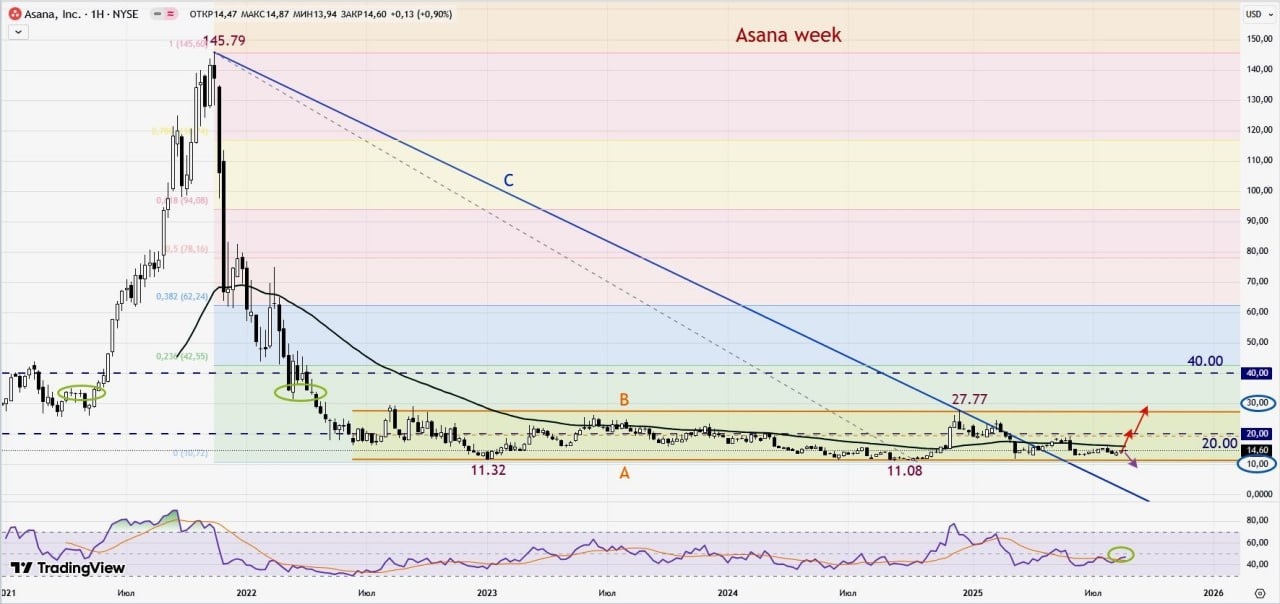 На недельном графике Asana (ASAN) видно, что акции компании сначала взлетели в пандемийном 2021 г, а потом так же резко упали в 2022 г более, чем в 10 раз, достигнув минимума на отметке 11.32. После этого бумага ушла в узкий боковой коридор «А-В», сежду уровнями 11.00 и 25.00, а все попытки прорваться выше заканчивались резким откатом вниз. Картальные отчеты 2025 г были неплохими, но акции ASAN остаются около своих минимумов. Практически все эксперты считают, что бумага сильно недооценена, а «справедливая цена», находится около круглой цифры 20.00. При этом, потенциал рост остается высокий, на хорошем квартальном отчете и позитивных прогнозах акции ASAN могут подскочить до последних максимумов 27.77 и выше до 30.00. Напротив, слабые цифры могут привести к снижению котировок, обновлению минимумов с целью 10.00.