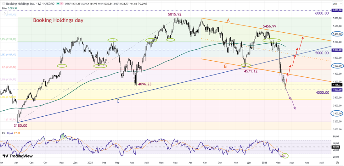 На недельном графике Booking Holdings (BKNG) видно, что акции компании выросли с июня 2024г по июль 2025г на 80%. В 3 квартале была стабилизация в довольно узком диапазоне 5400 – 5800, но потом началась просадка. В начале декабря бумага просела до отметки 4571, но потом быстро отскочила и встретила новый 2026г значительно выше психологического уровня 5000. Правда к концу января началось снижение, а в начале февраля оно перешло в обвал на фоне угрозы со стороны ИИ и общей распродажи в секторе онлайн-туризма. В начале этой недели акции BKNG вплотную подошли к сильной круглой цифре 4000 и выглядят очень перепроданными. На хорошем отчете бумага может возобновить рост, пройти минимум 4571, до линии «С» и далее к уровню 5000. Напротив, слабый отчет может спровоцировать пробитие уровня 4000 и далее к 3600.