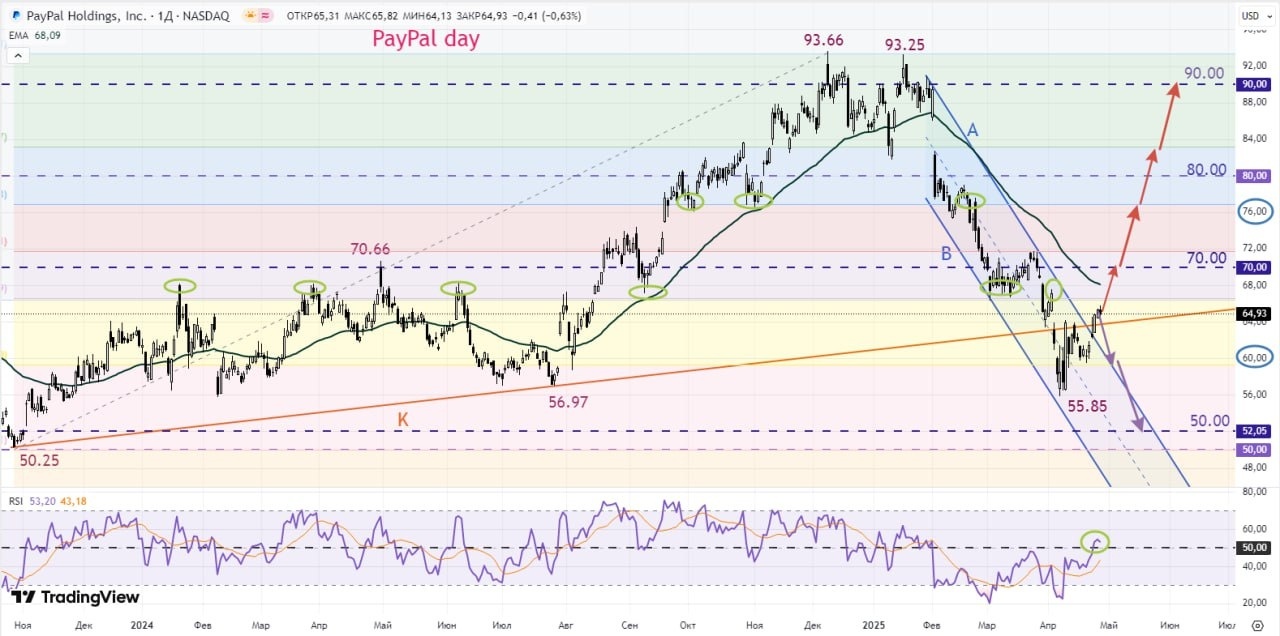 На дневном графике PayPal (PYPL) видно, что акции компании во втором полугодии 2024 г показали мощный бычий тренд, прибавив более 40%. В декабре бумага стоила выше 93.00 и после небольшой коррекции в начале января 2025 г снова попыталась пробиться выше, но не получилось. Сформировалась разворотная фигура «двойная вершина», после публикации квартального отчета за 4-й квартал 2024 г. В начале февраля акции PYPL резко просели, пробив круглую цифру 70.00, но смогли стабилизироваться около этого уровня. Но в начале апреля бумага возобновила падение вместе со всем рынком и обновила годовые минимумы, достигнув отметки 55.85. Во второй половине месяца начался новый рост на фоне улучшения внешнего фона, акции пробили верхнюю границу основного нисходящего канала «А-В». На хорошем отчете бумага продолжит рост к уровню 70.00 и выше до отметки 76.00 и наоборот, слабые цифры откинут бумагу до уровня 60.00 и ниже.