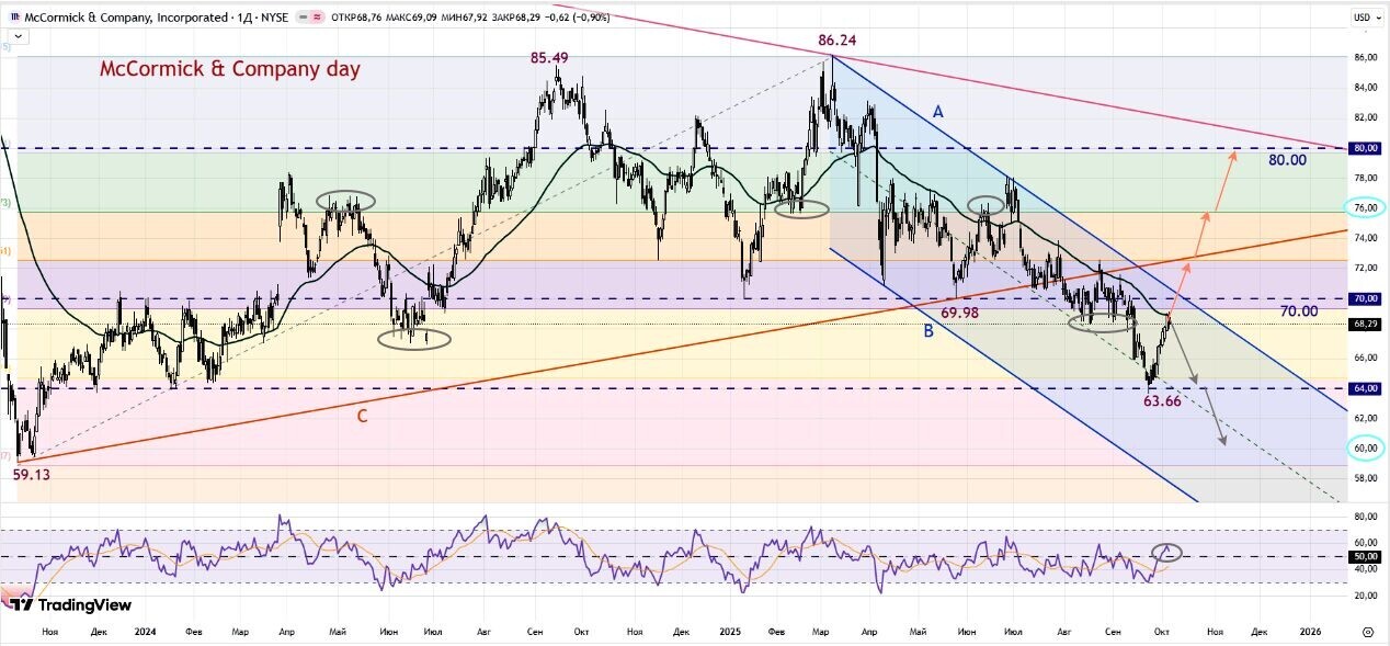 На дневном графике McCormick (MKC) видно, что акции компании в конце 2023 г упали до 3-летнего минимума, опустившись ниже уровня 60.00. Но в 2024 г начался новый рост, а ровно год назад бумага дошла до отметки 85.49, но потом провела ниже уровня 80.00 В первом квартале 2025 г акции МКС сильно лихорадило, но был достигнут новый 2-летний максимум на отметке 86.24. Во втором квартале бумага сильно упала на фоне новой тарифной политики Трампа, т.к. бизнес компания находится в различных мировых регионах. Это привело к слабой отчетности и акции МКС продолжили падение и в 3-м квартале, пробив сильную круглую цифру 70.00. В конце сентября бумага обновила 2-летний минимум, после чего резко отскочила вверх. На хорошем отчете рост может продолжится, главное пробить линию сопротивления «А» и уровень 70.00, после чего целями станут отметки 73.00 и 76.00. Напротив, слабый отчет снова отбросит цену к последнему low и ниже до уровня 60.00.