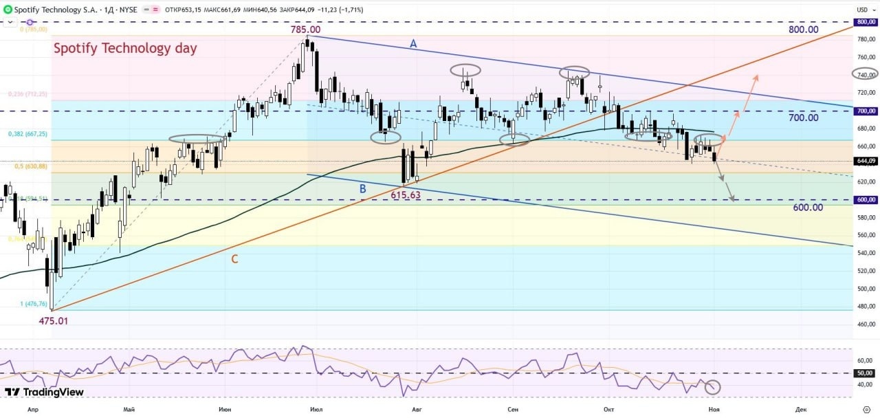 На дневном графике Spotify Technology (SPOT) видно, что акции резко выросли во 2-м квартале 2025 г, после апрельской просадки до отметки 475.01, вызванной общим падением рынка на тарифах Трампа. Уже в мае бумага поднялась выше сильного уровня 600.00, а потом обновила исторический максимум на отметке 652.00. Следующей целью стала круглая цифра 700.00, а после публикации хорошей квартальной отчетности, акции SPOT в конце июня установили новый high на отметке 785.00. После этого прошла ожидаемая фиксация прибыли и бумага возвратилась к уровню 700.00. В конце июля цена неожиданно упала на 10%, но быстро отскочила обратно, а после квартального отчета от 6 августа снова пошла вверх. Акции SPOT до конца 3-го квартала торговались вдоль круглой цифры 700.00, но в октябре немного снизилась, пробили трендовую линию «С» и закончили месяц около отметки 660.00. Если новый квартальный отчет порадует инвесторов, то бумага возобновит рост, пройдет уровень 700.00 и линию сопротивления «А», а целями будут отметки 740.00 и 785.00. Напротив, слабый отчет может ускорить снижение до отметки 620.00 и далее к круглой цифре 600.00.