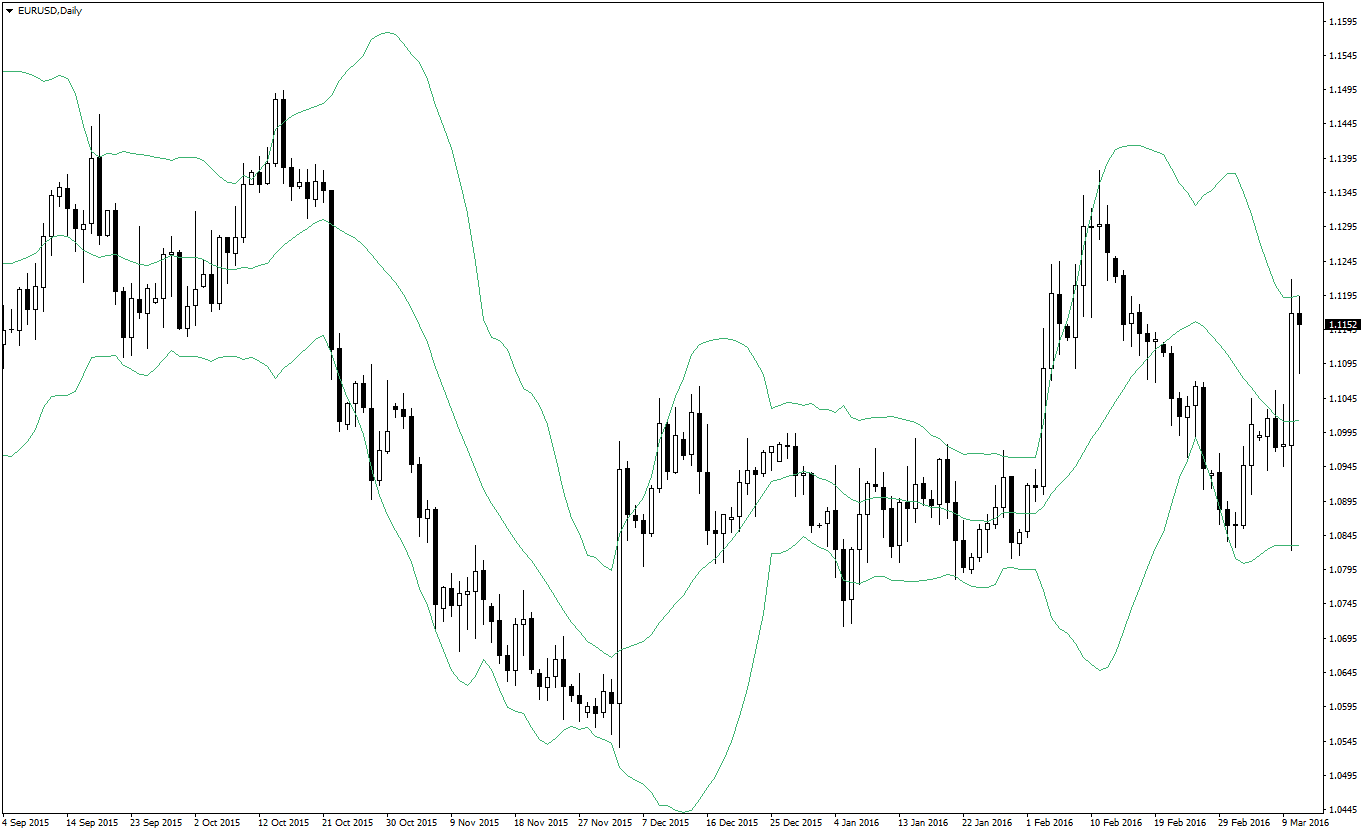 Полосы Боллинджера показывают диапазон ценового движения актива, состоят из трех линий — средней (SMA), демонстрирующей основное движение тренда, и двух границ, смещенных на определенное количество отклонений. Сужение или сжатие полос говорит о низкой волатильности. Цена, поднимающаяся к верхней полосе, говорит о перекупленности, нижней — о перепроданности.
