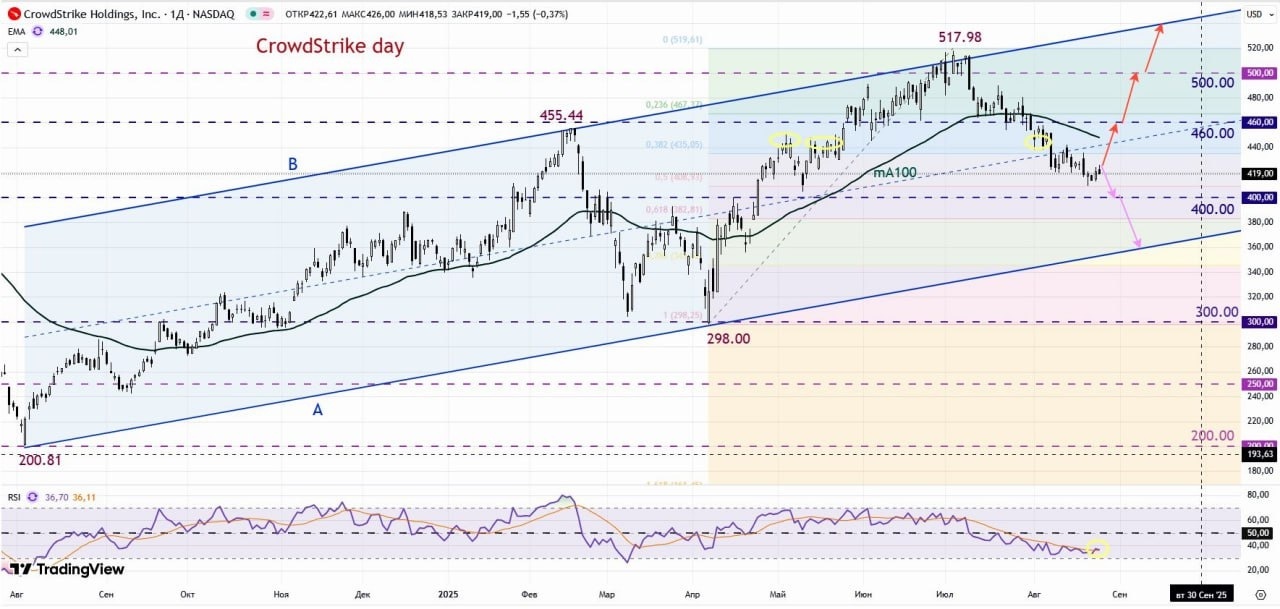На дневном графике CrowdStrike (CRWD) видно, что акции компании после сильного падения ровно год назад, с августа 2024 г начали новый рост в рамках восходящего канала «А-В». Правда в марте-апреле этого года бумага упала вместе со всем рынком на фоне тарифных планов Трампа, но потом возобновила рост. В июле акции CRWD обновили исторический максимум, достигнув отметки 517.98, после чего просели на 100 $ из-за фиксации прибыли спекулянтами. Сейчас бумага снова выглядит перепроданной, а тот факт, что цена так и не достала до круглой цифры 400.00 придает уверенности быкам. Если отчет понравится рынку, то акции CRWD возобновят рост, пройдут сильный уровень 460.00 и будут тестировать психологическую отметку 500.00. Напротив, слабые цифры ускорят снижение, цена пройдет уровень 400.00 и может упасть до линии поддержки «А» (360.00).