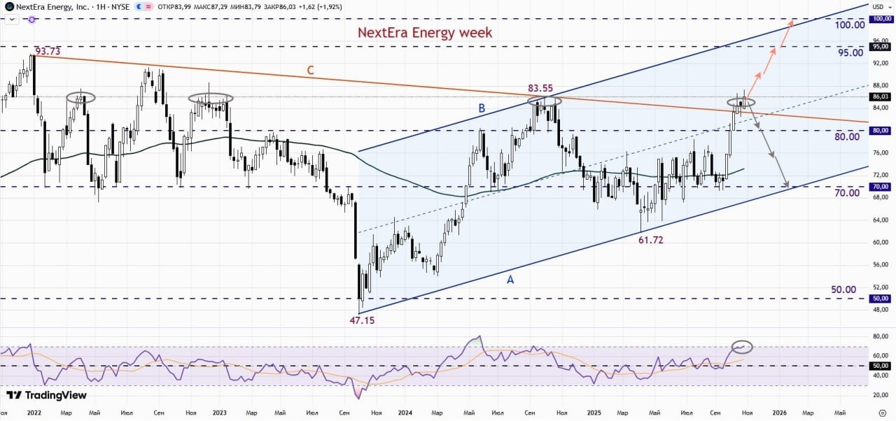 На недельном графике NextEra Energy (NEE) видно, что акции компании в конце 2021 г достигли своего максимума на отметке 93.73, после чего на долго ушли в боковик. Основной поддержкой выступила круглая цифра 70.00, но летом 2023 г этот уровень был пробит, бумага пробила важную отметку 50.00. В 2024 г акции NEE снова пошли в гору и достигли 2-летнего максимума на отметке 83.55, но в декабре снова упали и встретили 2025 г около уровня 70.00. Большую часть этого года бумага провела в боковом диапазоне между отметками 65.00 и 75.00 и только в конце сентября возобновила рост. Акции NEE пробили среднюю линию канала «А-В» и линию сопротивления «В». На хорошем отчете бумага может продолжить рост, обновить максимум и даже дойти до уровня 100.00. Напротив, слабые цифры могут откинуть акции до линии поддержки «А» и уровня 70.0.