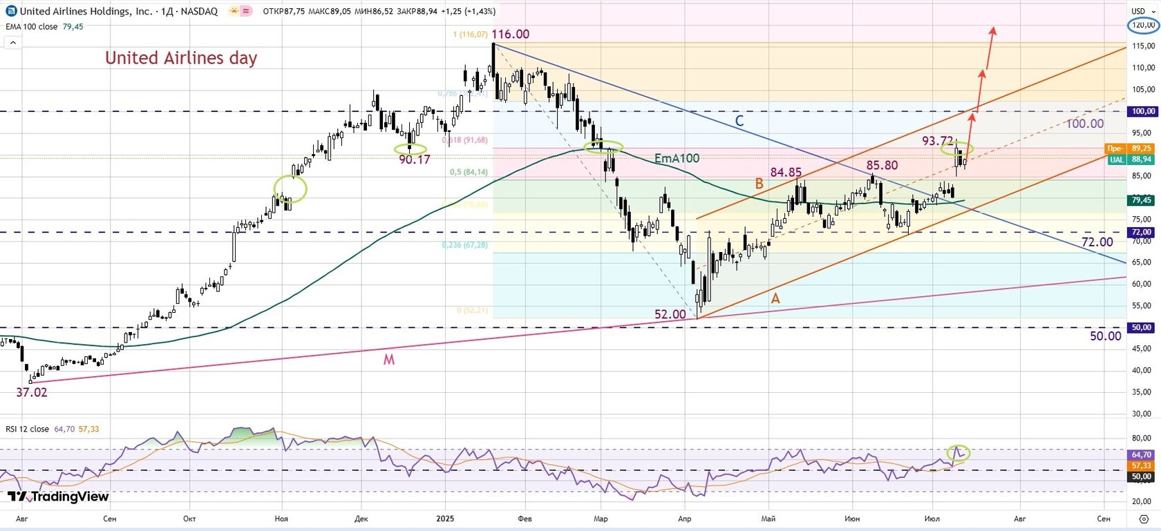 На дневном графике United Airlines (UAL) видно, что во втором полугодии 2024 г акции компании показали резкий рост. Бумага совершила настоящее ралли, в ходе которого цена выросла более, чем в 2.5 раза, превысив психологический уровень 100.00. В январе акции UAL обновили свои максимумы, достигнув отметки 116.00, после чего игроки стали фиксировать прибыль, бумага снова просела до круглой цифры 100.00. В марте-апреле акции UAL упали вместе со всем рынком до минимума на отметке 52.00, но ниже не прошли. Весь май и июнь бумага провела в боковом диапазоне между уровнями 72.00 и 85.00, но потом пробила линию сопротивления «С» и возобновила рост в рамках канала «А-В». На прошлой неделе цена пробила среднюю линию этого канала и на хорошем квартальном отчете может продолжить рост к уровню 100.00, пробить линию сопротивления В и достигнуть своих максимумов. На слабом отчете бумага может упасть в район 80.00 и далее до уровня 72.00.