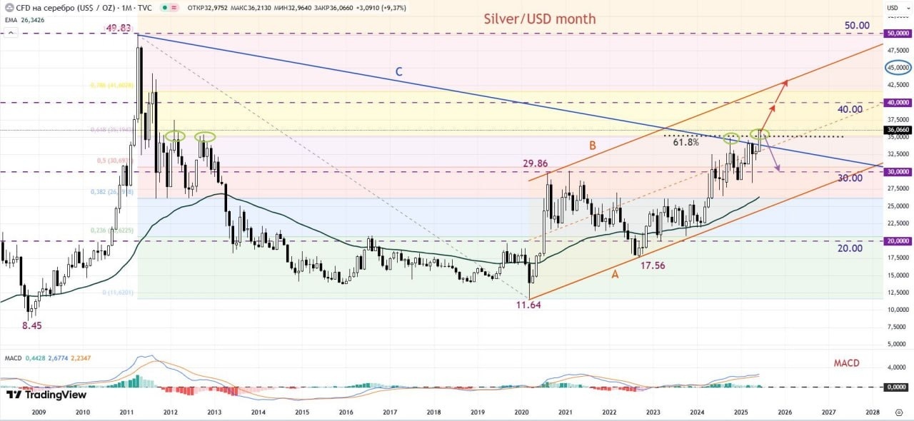 На месячном графике Silver/USD видно, что после мощного роста в 2010−11гг серебро достигло своего исторического максимума на отметке 49.83 $ за унцию, после чего почти на 10 лет ушло в нисходящий тренд, достигнув минимума на отметке 11.64. С началом пандемии в 2020 г начался и новый рост серебра, но с высокой волатильностью. После почти 3-кратного роста до круглой цифры 30.00, металл снова падал ниже 20.00, но в 2024 г был новый рывок вверх. Сейчас серебро пробило среднюю линию основного канала «А-В», линию сопротивления «С», а на этой неделе и сильный уровень 61.8% коррекции от всего падения 49.83−11.64. Но серебро выглядит очень перекупленным и может скорректироваться до отметки 32.00 и даже до круглой цифры 30.00. Но потенциально металл имеет все шансы продолжить рост с целью 40.00 $ за унцию и выше.